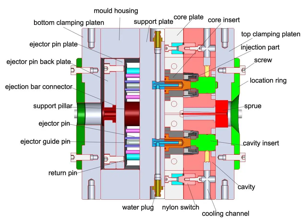 A: The core and cavity are the two halves of the mold where the hot molten plastic material is injected into the core and cavity and the gap between the core and cavity is filled with the hot molten material during the injection molding process and then hardened into the final shape.